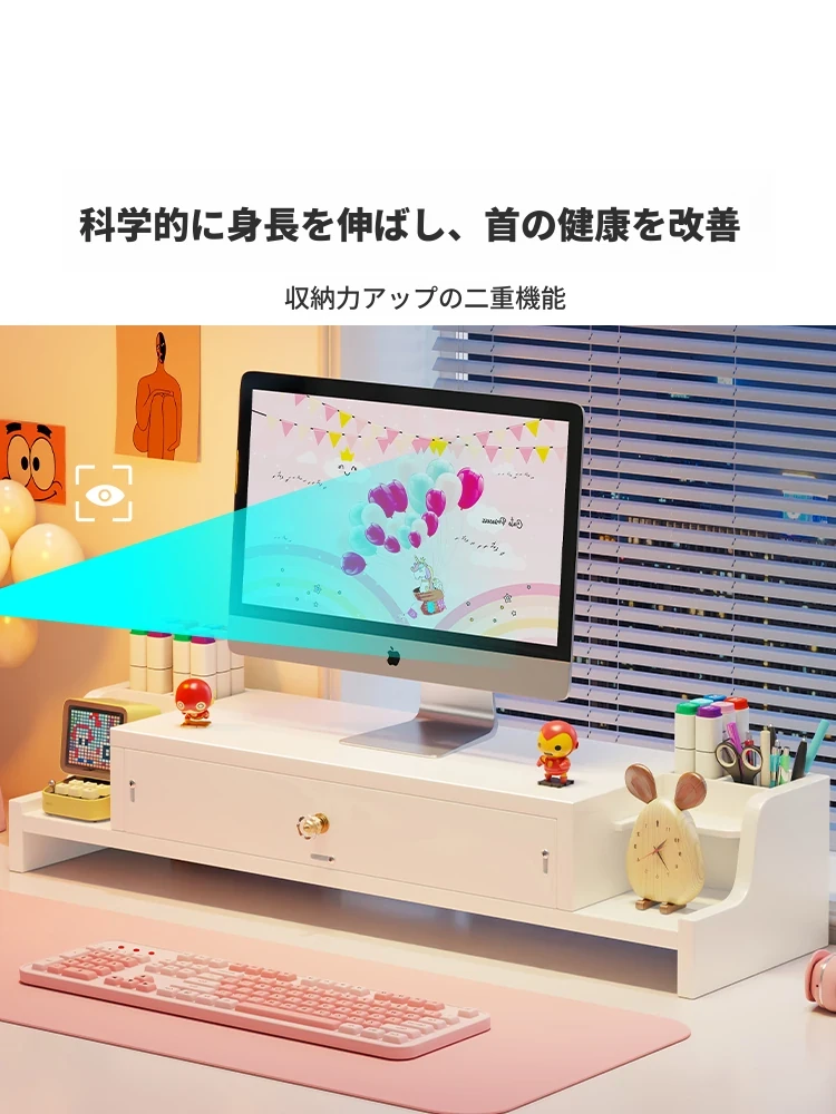 学生寮に最適!机上のスペースを有効活用するデスクトップモニター昇降スタンド - 引き出し付き収納ラックで、整理整頓も簡単。快適な学習環境を実現!