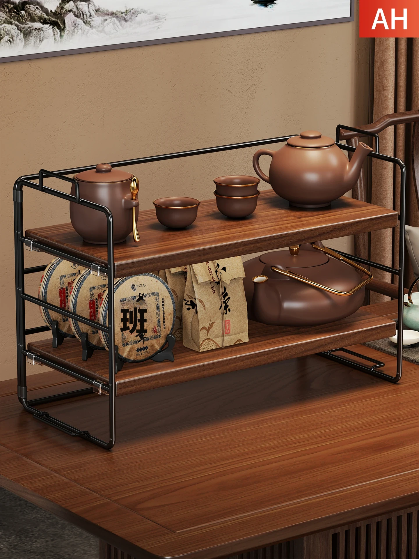 無垢材デスク用ティーカップ収納ラック 小型博古架 中華風紫砂壺ディスプレイスタンド ティーセット・マグカップ用ラックで、あなたのティータイムをより特別に演出!高品質な素材で、インテリアにもぴったり!