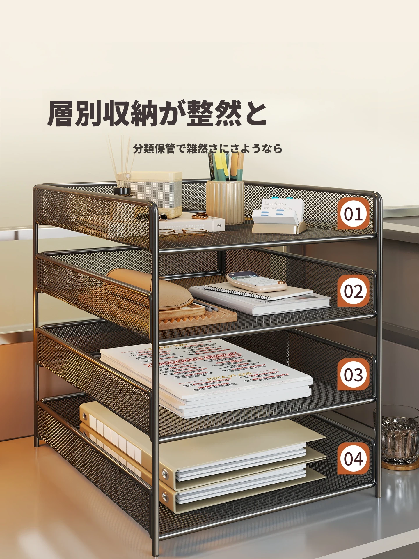 シンプルなデザインのデスク収納ラック|オフィス・学生向け|書類や本をスッキリ整理!デスク周りをスリムに整頓し、作業効率UP!