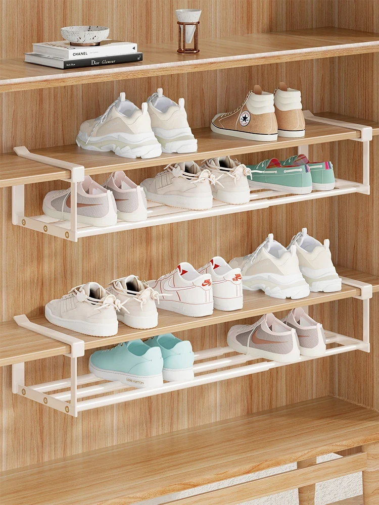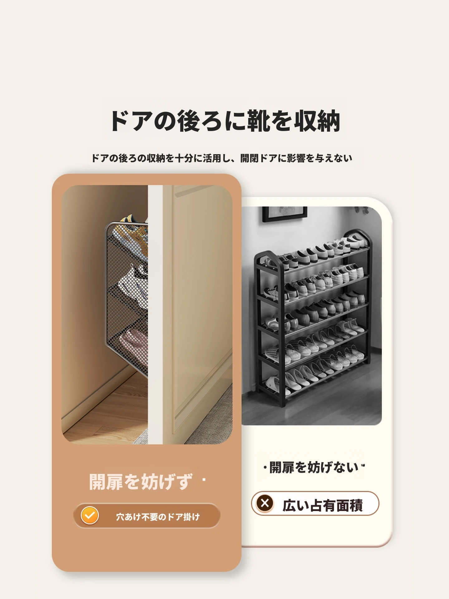 靴をスッキリ収納!壁掛け式・穴あけ不要の多段シューラック - 狭いドアの後ろにもぴったりフィット、靴を整理整頓してお部屋を広く見せる便利アイテム!