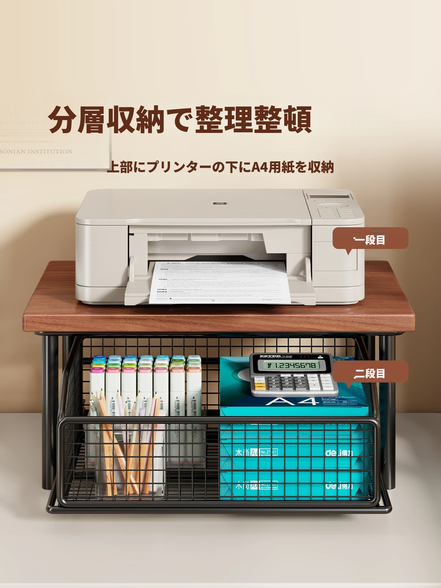 オフィスデスク用のコンパクトな2段プリンターラック - A4用紙収納もできる便利なデスクトップ整理棚!あなたの作業スペースをスッキリと整え、効率的にサポートします!