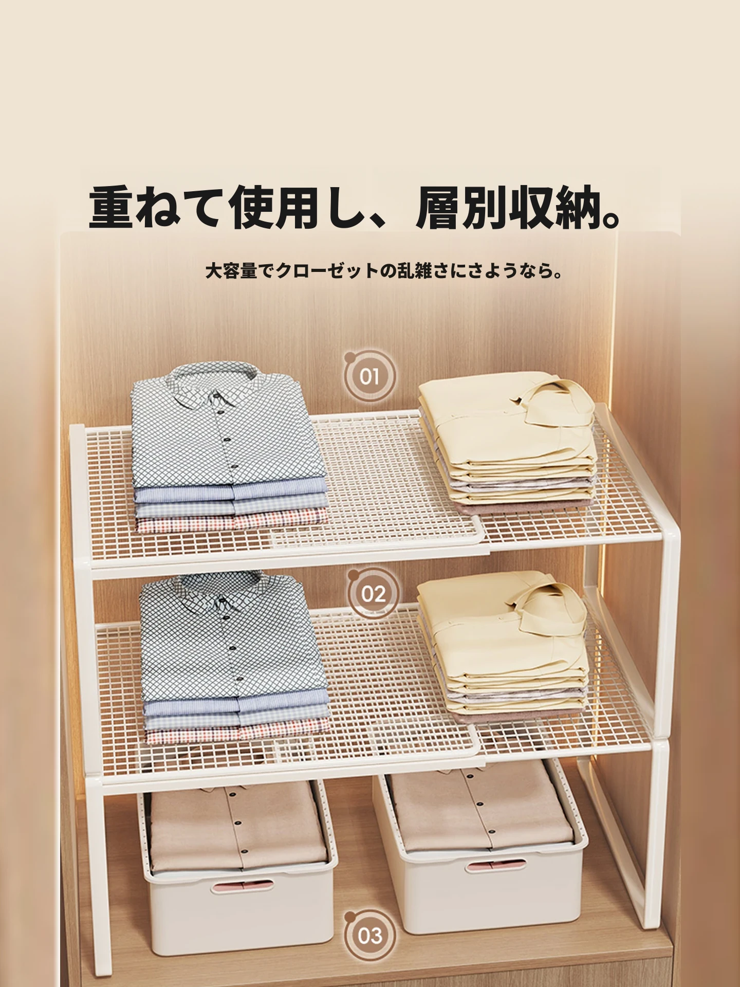 衣類収納の必需品!伸縮式仕切り棚でクローゼットをスッキリ整理!洋服や小物の収納が簡単にできる便利なアイテムです。おしゃれな空間を演出しながら、無駄なスペースを有効活用しましょう!