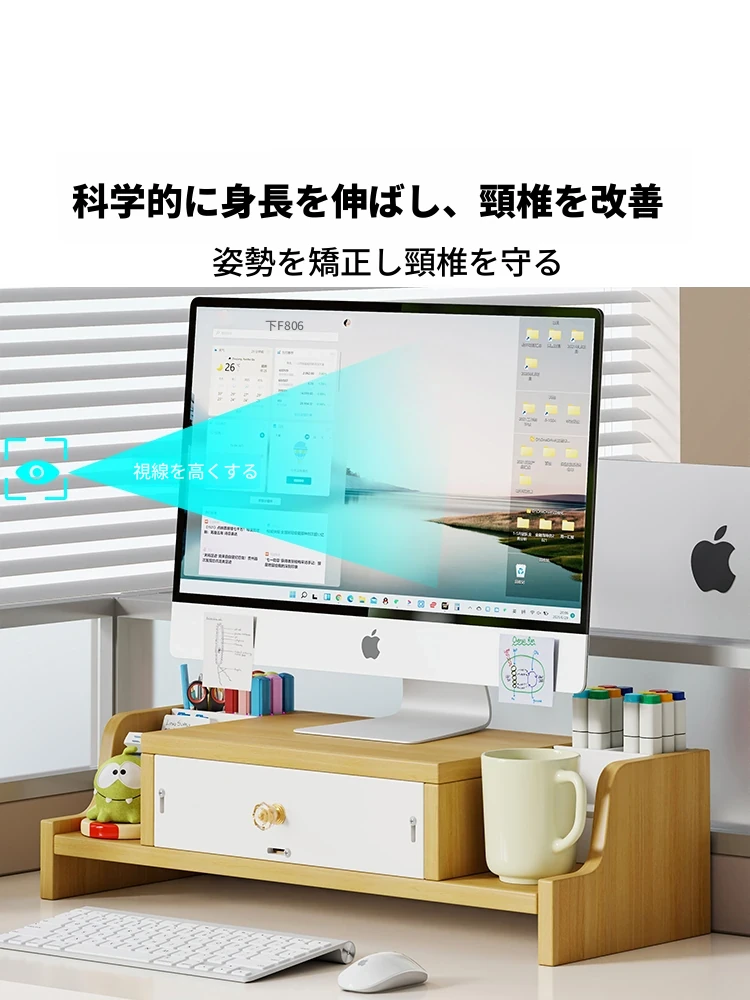 デスク上のモニターを快適に!引き出し付きPCスタンド - オフィスの作業スペースを一新する便利アイテム!デスクをスッキリ整理して、効率的な仕事環境を実現!