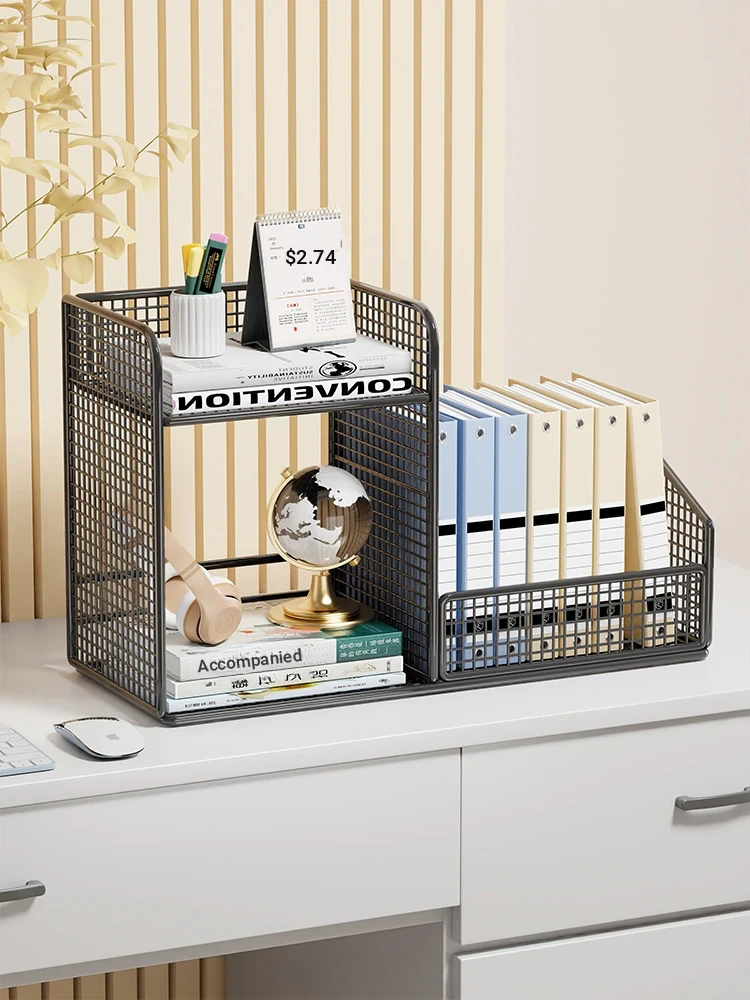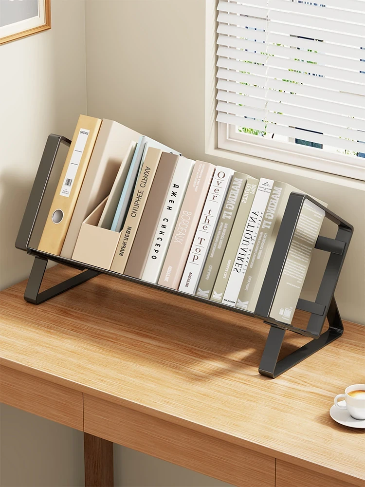 Compact Iron Bookshelf Organizer - Stylish Desktop Storage Rack for Office & Home, Perfect for Students. Ideal for Books and Stationery, Space-Saving Design.